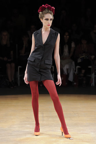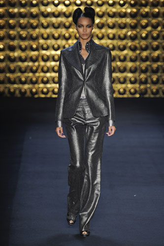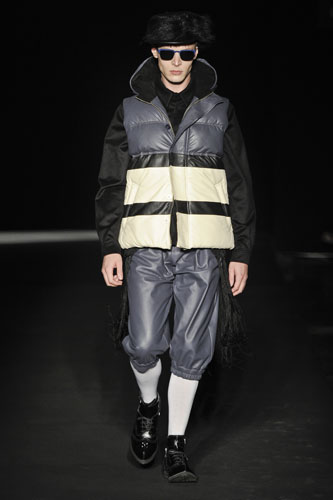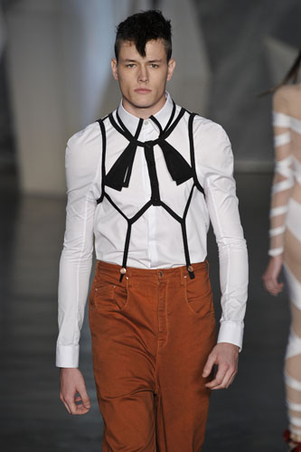 Alexandre Herchcovitch masculino: o traje típico do judeu ortodoxo foi o ponto de partida. Como ele nunca muda, Alexandre pensou nos elementos da religião que possam transformá-lo. E assim trabalhou a estrela de Davi em estampas e texturas, colocou o Talit (xale para reza) como cinto e ainda trouxe casacos esportivos volumosos como complemento especial, já que é a única peça fora da indumentária que é permitido usar para se aquecerem no inverno.