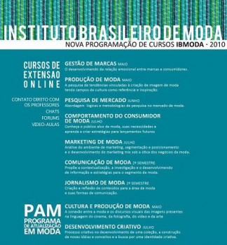 O Instituto Brasileiro de Moda acaba de divulgar sua nova programação para 2010. Além do PAM, Programa de Atualização em Moda, o Instituto oferece também uma grade de cursos de extensão online. Abordando temas como Gestão de Marcas, Comportamento do Consumidor, Jornalismo de Moda, entre outros. Os cursos oferecem contato direto com o professor, chats, fóruns, além de vídeo-aulas.