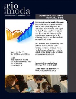 O Instituto Rio Moda oferece nos dias 13, 20 e 27 de maio, o workshop de Planejamento de Compras e OTB com Leonardo Marque. O curso irá exercitar o uso de indicadores de gestão e o Open To By, como ferramenta de gestão de compras.