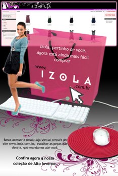 Acaba de entrar no ar a loja virtual da Izola com 40 produtos da coleção de inverno, “Love Pop”. Clique em www.izola.com.br para acessar o site e escolher as peças que a Izola entrega em qualquer lugar do Brasil. Com a loja virtual, a marca pretende expandir sua área de atuação para além das fronteiras do Rio de Janeiro, onde atualmente possui três lojas: uma em Ipanema, uma na Tijuca, e uma loja de fábrica em São Cristóvão.