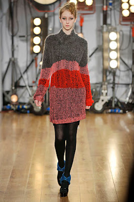 A Louise Goldin é uma das minhas novas estilistas preferidas. Primeiro, pelo que ela faz com o tricô. Segundo, porque ela sabe misturar incrivelmente as cores. Essa coleção era meio “esquimó espacial”, com uns desenhos geométricos, amarrações, leggings, capuzes e sapatos by Pierre Hardy. Adorei!