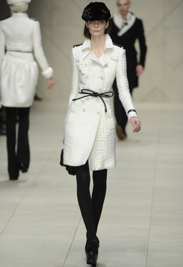 A Burberry é a marca britânica que melhor representa a união entre tradição e modernidade e desta vez transmitiu o desfile ao vivo no Picadilly Circus. Christopher Bailey pensou em Jean Shrimpton e outros ícones dos anos 60 para recriar trenches e casacos com botões grandes, em cores vivas (azul, laranja, vermelho, verde) ou xadrez, formas ovo e calças skinny. As peles também tiveram bastante espaço enquanto os casacos brancos do final eram acinturados com cintos fazendo laços.