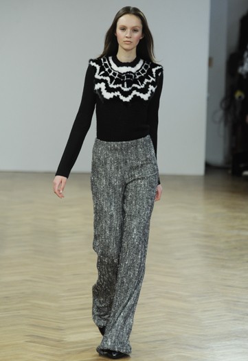 Num dia de pesos pesados da moda britânica, tradição e modernidade se encontraram, começando pela Pringle of Scotland com seus tricôs, peles e tweed em muitas peças de alfaiataria, incluindo pantalonas e capris. Nos detalhes, franjas nas barras dos casacos formando novas texturas.