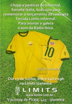 Acontece amanhã na loja da grife Limits em Ipanema, o lançamento da Camisa Torcida Limits Informal. O evento que terá inicio às 14h contará com muito chopp e pesticos do Informal, além de sorvetes Itália. Para animar a galera o som da Rádio Ibiza, parceiro da MODALOGIA.