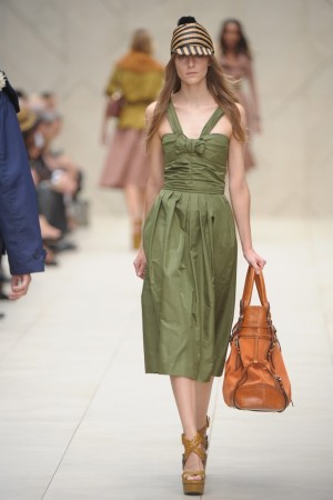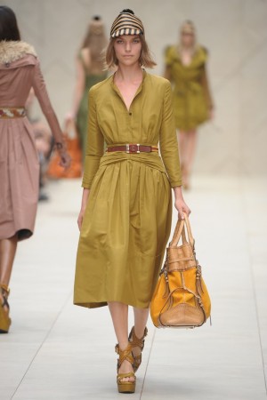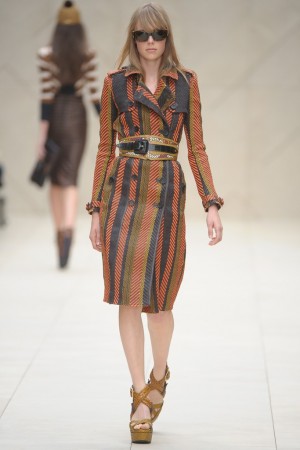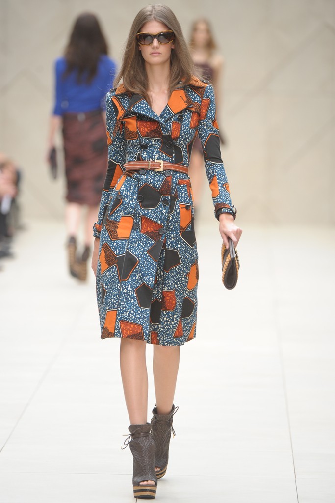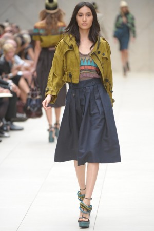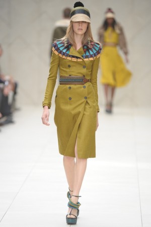 Partindo para o outro vídeo, do desfile propriamente dito (que já está com casacos e bolsas à venda no site até 26 de setembro), Christopher Bailey seguiu esses contrastes numa coleção cheia de elementos artesanais. Aplicações de ráfia e couro, bordados, acessórios de palha, cores de pedras preciosas e tecidos naturais marcaram o desfile, que começou com saias rodadas de cintura alta, teve saias lápis bem ajustadas, jaquetinhas curtas de couro ou algodão, parkas, peças em jacquard, tricô e crochê, listras horizontais e verticais e os famosos trenches feitos de vários materiais. Como se não bastasse, a trilha sempre irretocável teve U2 e George Harrison.