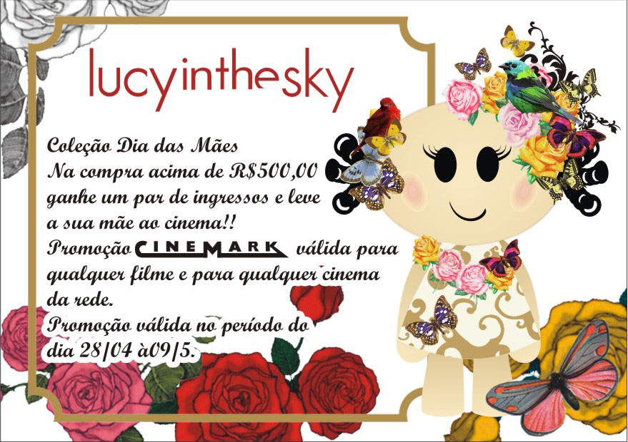 A Lucy in the Sky preparou uma surpresa muito especial para o Dia das Mães, que vai unir ainda mais mães e filhas. Até o dia 9 de maio, nas compras acima de R$ 500,00 efetuadas nas lojas da marca, elas ganham um par de ingressos para assistirem juntas a qualquer filme em cartaz na rede Cinemark. Os convites dão direito a uma sessão, em qualquer dia e horário. www.lucyinthesky.com.br