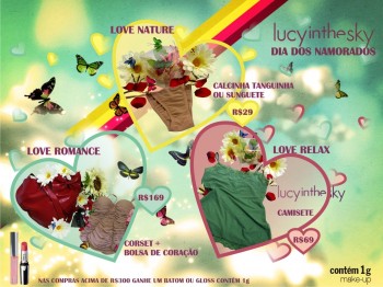 A Lucy in the Sky traz mimos para comemorar o Dia dos Namorados. Ótimas opções são os kits: Love the Nature, para quem ama a natureza; Love Relax, para quem leva a vida numa boa; Love Party, para quem gosta de uma festinha e o Love Romance, para quem ama viver intensamente. E não pára por aí, até o dia 12 de junho, nas compras acima de R$ 300 efetuadas nas lojas da marca, o cliente ganhará um batom ou um gloss da marca Contém 1g. www.lucyinthesky.com.br