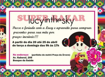 A Lucy in the Sky, marca jovem feminina, promove um bazar especial na fábrica. São peças das coleções passadas com até 80% de desconto. Além disso, as formas de pagamento estão super bacanas: dinheiro, cheque, cartões visa e mastercard e ainda o parcelamento em três vezes sem juros no cartão de crédito, com parcela mínima de 100 reais. A promoção acontece até o dia 25 de abril. Vale a pena conferir!