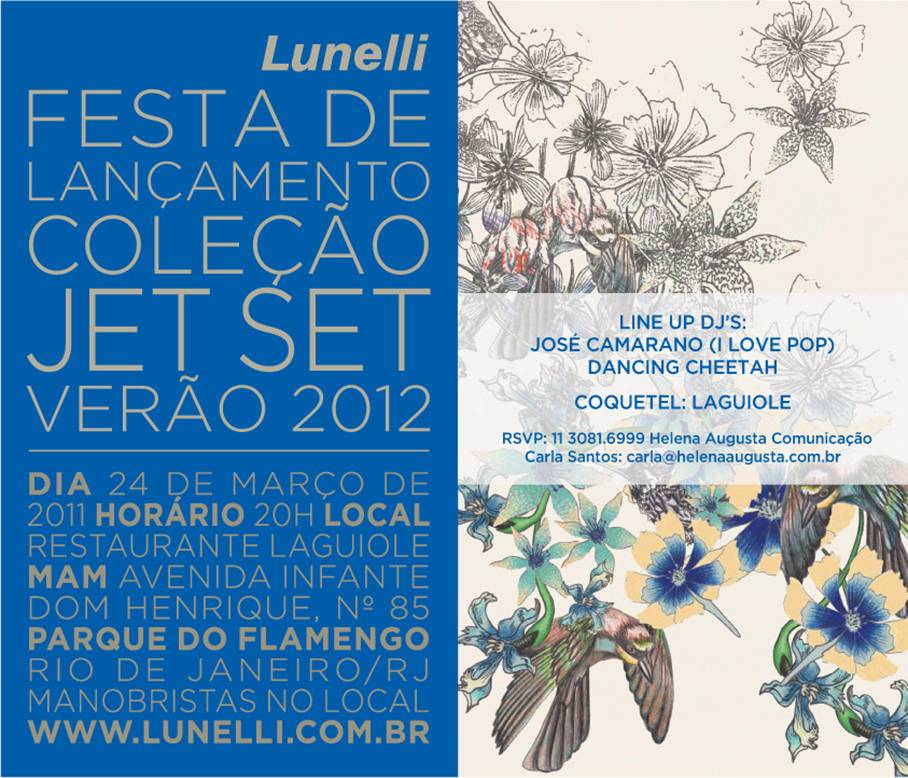A Lunelli, uma das mais importantes empresas têxteis brasileiras, promove hoje a festa de lançamento da coleção Jet Set Verão 2012, no Rio de Janeiro. O evento que será realizado no restaurante Laguiole, no Museu de Arte Moderna, apresentará as principais tendências para a estação e adiantará as novidades de produtos, cartela de cores e estamparia da nova coleção da Lunelli.