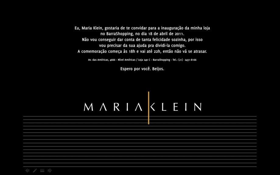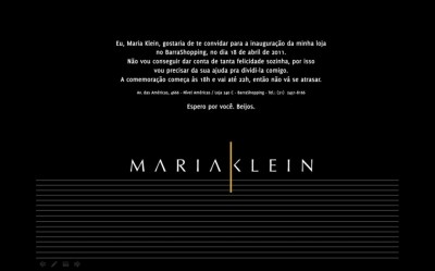 A multimarcas Maria Klein abre suas portas no dia 18 de abril, às 18h, no Barra Shopping. No espaço, serão vendidas peças do mercado de luxo nacional. Com projeto, arquitetura e decoração assinados por Ricardo Campos, toda a estrutura do espaço foi feita em material ecologicamente correto. A proprietária, a analista de sistemas Maria Klein, vem de uma carreira bem sucedida no mercado de petróleo e gás e resolveu investir em sua paixão, a moda. “A ideia surgiu faz dois anos, e queria ir para outro ramo de atuação, para expandir os negócios na área do comércio. E nada melhor que o mundo fashion”, explica a empresária.