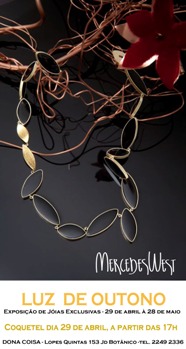 Acontece entre os dias 29 de abril a 28 de maio a exposição da designer de joias Mercedes West na Dona Coisa. Inspirada no contraponto entre a organicidade e a geometria, Luz de Outono é o nome dado ao projeto que tem como base um expositor de cobre em forma de planta onde ficam as joias feitas a partir de um triângulo original. Dessa forma geométrica foram nascendo as peças, um lado de um triângulo ajudou a formar o outro e assim, sucessivamente, e de maneira orgânica, todas as joias se relacionam.