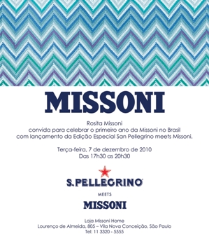 Celebrando o primeiro ano da Missoni no Brasil, Rosita Missoni promove o lançamento da edição especial San Pellegrino meets Missoni, hoje (07/12), das 17h30 às 20h30, na loja Missoni Home na Vila Nova Conceição, em São Paulo. Já amanhã, a matriarca da família, criadora do icônico zig zag, participará do Casa Cor Stars, evento do grupo Casa Cor, no Cinemark do Shopping Iguatemi.