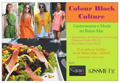 A Kissmet e o Bistro Mac organizaram um encontro de moda e gastronomia, que vai acontecer no dia 27 de julho. Haverá uma palestra sobre as tendências de verão 2011-12, onde o colour block será um dos temas abordados. O evento será realizado no Bistro Mac, às 16h.