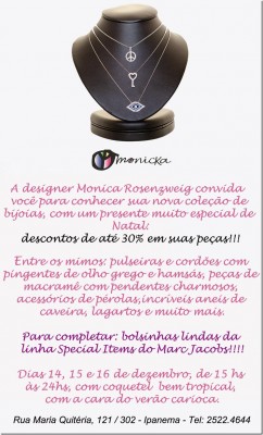 A designer Monica Rosenzweig promove até amanhã o bazar pré-natal com descontos de 30% em todas as suas peças. Entre os destaques estão as pulseiras de macramê e de couro com pingentes, os cordões com sal grosso, olhos gregos e hamsás e as bolsas legítimas da linha Special Items do Marc Jacobs.