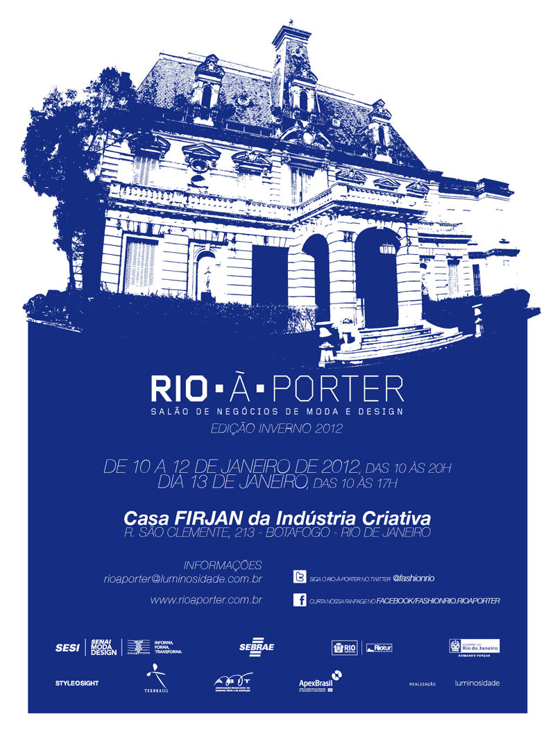 A próxima edição do Rio-à-Porter, feira de negócios que acontece paralelamente ao Fashion Rio, não vai acontecer no Pier Mauá como nas edições passadas, mas em Botafogo, na Casa Firjan de Indústria Criativa. A proposta agora é que expositores fiquem alocados de uma forma mais intimista, seguindo uma dinâmica inovadora. Novidades devem ser anunciadas em breve!