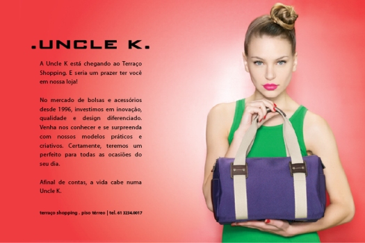 A Uncle K convida vocês a conhecer a mais nova loja da marca no Terraço Shopping, em Brasília. No mercado de bolsas e acessórios desde 1996, a Uncle K é conhecida por investir em inovação, qualidade e design diferenciado, com modelos práticos e criativos.
