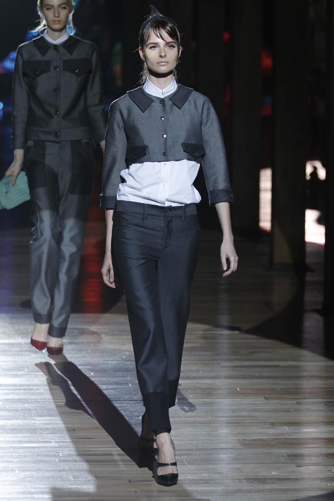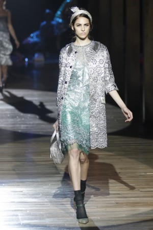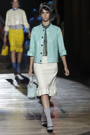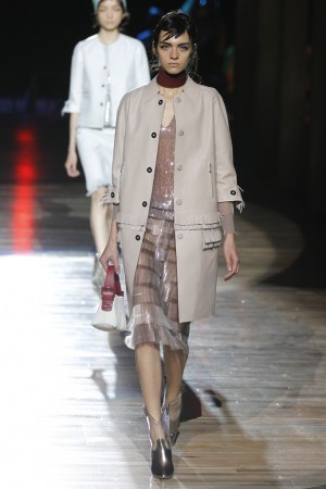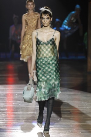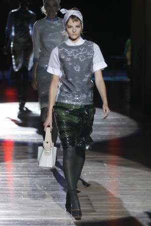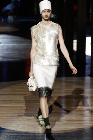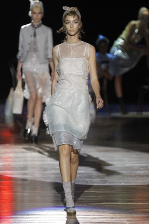 O show começou com looks neutros, em tons de cinza e prata, e brilhos nos materiais sintéticos, com texturas de papel e plástico. Os vestidos retos e as franjas marcavam bem os “anos loucos”, enquanto os jogos de proporções das jaquetinhas, mais curtas ou na cintura, sobre camisas e blusas davam ares bem jovens aos modelos. Tons de verde, amarelo e azul também ganharam espaço, sobretudo nos looks esportivos de suéteres de mangas raglã, usados com saias nos joelhos e babados na barra. Transparências reforçaram o contraste entre o natural x sintético, em peças mais delicadas.