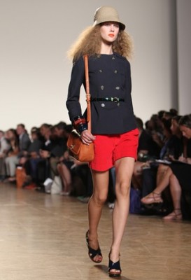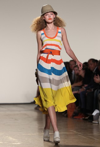 Marc by Marc Jacobs: em sua segunda linha, os anos 70 também estavam presentes, mas de um jeito mais esportivo e com uma cartela variando entre o amarelo, laranja, cinza e marrom, além de muitas listras. Macacões, vestidos de saias pregueadas de comprimento midi, shorts, bermudas, sobreposições de malhas e golas-lenço com pequenos toques de militar deram um clima leve ao desfile.