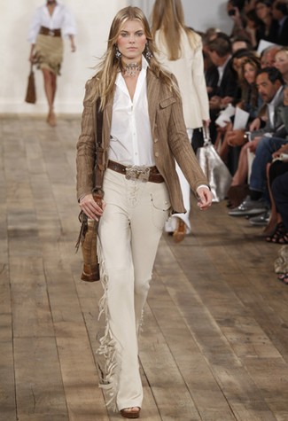 Ralph Lauren: numa coleção quase toda branca (salvo os acessórios em marrom), Ralph visitou um território bem familiar: o velho oeste. Por incrível que pareça o resultado foi até bem urbano, apesar das franjas nas barras das peças e nas rendas em blusas e vestidos. Separadamente, as calças (de todas as modelagens), macacões e até os lenços no pescoço vão criar bons looks anos 70, como pede a tendência.