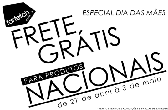 O Farfetch.com promove uma campanha especial para o Dia das Mães: a partir de amanhã (28/04), todos os produtos das marcas nacionais terão frete grátis. Esta campanha irá até o dia 03 de maio. Além disso, o site preparou um editorial especial para a data com estilistas e designers parceiros e seus filhos falando sobre presentes. Vale conferir as dicas da designer Camila Sarpi e dos filhos da estilista Raquel Davidowicz, Andrea Garcia e Emanuelle Junqueira. Os termos e as condições da campanha estão disponíveis no site.