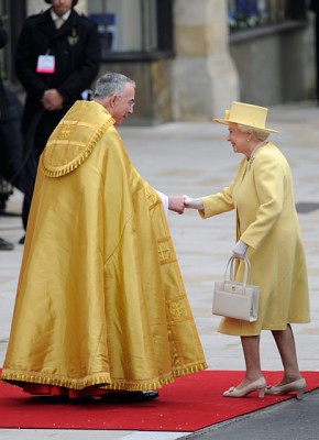 A rainha Elizabeth, toda de amarelo com sua indefectível bolsinha!