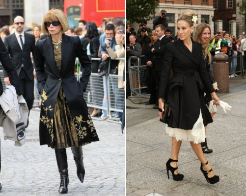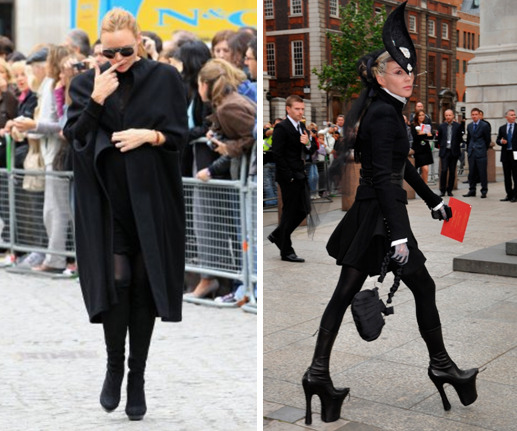 A estilista Stella McCartney escolheu um sóbrio vestido preto e botas de cano alto, com um sobretudo por cima enquanto a excêntrica Daphne Guinness roubou a cena usando os sapatos da grife, com um inusitado chapéu.
