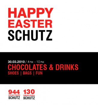Páscoa da Schutz By 2010-03-302010-03-31Sem categoria Para comemorar a Páscoa com estilo, a Schutz promove hoje o coquetel “Chocolates & Drinks”. O evento acontece das 16 às 22 horas, na loja da Garcia D’Ávila, 130 – Ipanema, RJ.