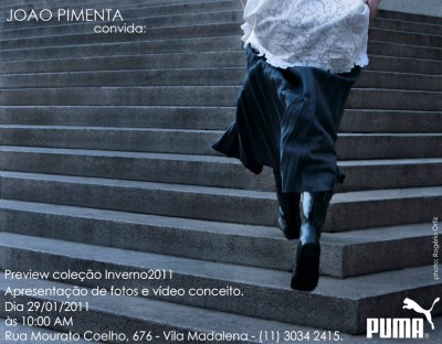 A PUMA acaba de reforçar sua parceria com o estilista João Pimenta. Desta vez a grife alemã irá apoiar o pré-lançamento da coleção de inverno 2011 do criador e o seu segundo desfile no São Paulo Fashion Week.