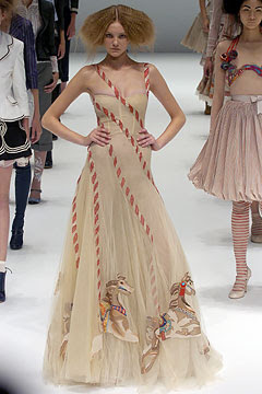 Essa é a pergunta que mais ouço depois que conto que vou casar. Aí respondo que gostaria que fosse o Alexander McQueen, já que tem um vestido de uma coleção antiga dele (primavera/verão 2005) que é “o” vestido dos meus sonhos (foto), sem as fitinhas de carrossel, claro! Infelizmente não vai mais poder ser ele (quem sabe por obra do destino o tal vestido vintage atravessa meu caminho?) e por enquanto não estou tão preocupada com a pergunta, pois ainda tenho muito tempo para decidir.