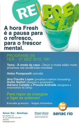 Acontece amanhã a partir das 19h, mais uma edição do Refresh. O evento que tem a iniciativa do Senac Rio e é dedicado aos profissionais de moda, terá como tema “À Moda da Casa” e falará da proximidade entre moda e decoração nas tendências mundiais.