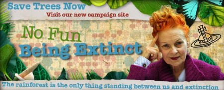 Vivienne Westwood também é intima das causas ambientais há muito tempo e seu mais recente projeto é para a organização Cool Earth, que pretende salvar as florestas tropicais e seus habitantes. A estilista doou 1 milhão de libras para a ONG e vai usar sua influência para divulgar a campanha “No Fun Being Extinct” e arrecadar fundos. Segundo ela, personalidades como Kate Moss, Lily Cole e Sadie Frost devem apoiá-la no projeto. A meta é juntar 6 milhões de libras e ajudar as comunidades a viver de uma forma sustentável. Os detalhes podem ser conferidos aqui: