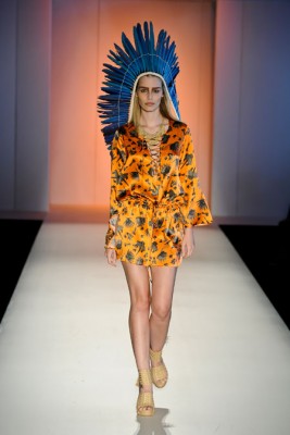 Bianca Marques: Encerrando a temporada do Rio-à-Porter, a estilista Bianca Marques apresentou uma coleção inspirada pela cultura indígena. O desfile que contou com a participação da modelo Yasmin Brunet, trouxe para as passarelas uma coleção repleta de tons terrosos, alaranjados e com pitadas de preto e cinza.  As peças que apareceram com detalhes de pregas em tecidos como shantung, tafetá e seda, ganharam equilíbrio entre formas estruturadas e modelos mais fluidos. O destaque ficou por conta das estampas exclusivas, ponto alto da coleção, e da linha de acessórios, que trouxe bossa e colorido para o outono/inverno da grife. (Marianna Eichenberg)