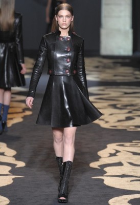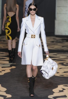 Finalmente, Donatella Versace misturou militar, em botões dourados e casacos de lã com muitos bolsos, a tubinhos impecavelmente cortados, com aplicações de flores e curvas em cores contrastantes. Outro foco de cor apareceu nos colarinhos de peles. Os tailleurzinhos de couro, com saias de pregas eram perfeitos, enquanto os tradicionais longos apareceram só no final e com muitas plumas.