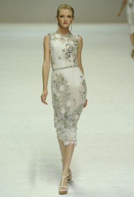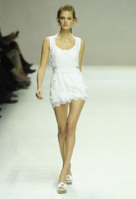 Dolce & Gabbana: sexy (com as angels Izabel Goulart, Alessandra Ambrosio e Carol Trentini na passarela) e pseudo inocente apesar da profusão dos looks em renda branca, a coleção trouxe o melhor da dupla: peças inspiradas em lingerie, algumas estampas de leopardo, formas reveladoras e muita feminilidade. Entre vestidos curtos e midis, vale destacar o mix entre estampas e rendas, os terninhos de calça capri de algodão e os bordados delicados nos looks finais.