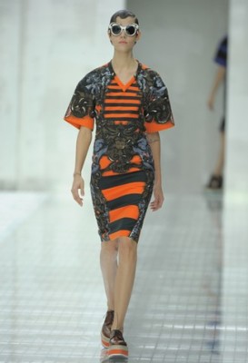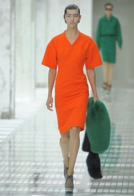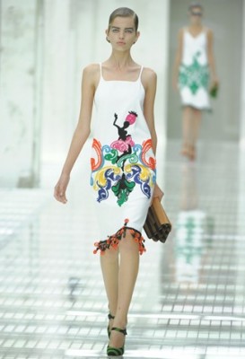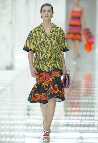Minimalismo barroco. As duas palavras que são paradoxais fazem total sentido para Miuccia Prada, que estava cansada do minimalismo, tema que tanto explorou nesses últimos 20 anos. Traduzindo para a moda: formas simples com cores vivas, estampas divertidas e detalhes plásticos passaram a mensagem pretendida. Logo de cara, saias lápis com jaquetas de ombros arredondados, fechadas por zíperes em looks monocromáticos de laranja, verde e azul. Logo depois vieram as listras grossas e finalmente a grande surpresa da noite: silks de macacos e estampas de bananas!