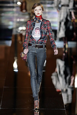 Domenico Dolce e Stefano Gabbana surpreenderam de novo. Depois da coleção de primavera super romântica, agora o campo inglês e os anos 70 se encontraram na passarela, numa evolução do que eles trabalharam na D&G. Resumindo: os dias de looks super sexy da dupla já eram! O novo comprimento é o longuete das saias em tweed ou xadrez, acompanhadas de suéteres e jaquetas com lenços amarrados no pescoço e boinas. As calças jeans e de veludo cotelê são retas e com a barra italiana. Os terninhos, com colete, estavam impecáveis. Os 70’s ficaram por conta da estampa David Bowie de uma camiseta. Outros detalhes: peles, bolsas clássicas com fecho de metal, sapatos oxford e rendas. Os looks finais ficaram um pouco deslocados, já que eram vestidões volumosos, como os da última coleção. Mas tudo bem. A mulher de Dolce & Gabbana pode estar mais comportada, mas continua querendo chamar muita atenção!