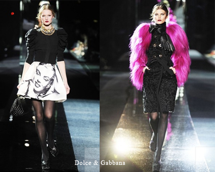 Dolce & Gabbana – A estilista italiana Elsa Schiaparelli foi a inspiração do inverno Dolce & Gabbana 2009. As referências ao universo de Elsa, famosa por suas criações surrealistas, apareceram nos ombros volumosos cheios de pregas, nas luvas que viraram chapéus e cachecóis e no perfume de anos 30 e 40 que permeou a coleção. E nas peças rosa shocking, como ficou conhecida a cor preferida da estilista. O estilo Dolce & Gabbana, porém, não ficou de lado. Desfilaram na passarela os vestidos de estrutura de corset inspirados na lingerie, outros justos com transparências e rendas, além dos vestidos com crinolinas exageradas. Marylin Monroes também não ficou de fora, estampando saias e peças bem-humoradas, como Elsa Schiaparelli faria.