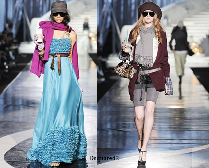 Dsquared2 – As modelos entram na passarela da Dsquared2 bebendo cafés Starbucks, checando seus telefones Blackberry, deixando jornais saindo das bolsas, usando fones de ouvido e eventualmente fumando um cigarro, nos remetendo imediatamente aos flagras de celebridades pelos papparazzi que tanto vemos em revistas. O hi-lo e o mix-and-match ditam o styling, que acabou chamando mais atenção que a coleção em si. Muita sobreposição, mistura de cores, estampas de onça combinadas ao xadrez e uma profusão de cahecóis são as apostas da marca para um inverno comercial, prático e urbano.