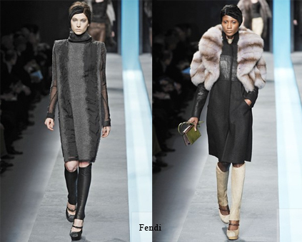 Fendi – O inverno da Fendi conjuga luxo e praticidade, numa mistura de materiais que une peles, couro e veludo. A silhueta segue a linha dos ombros quadrados e a geometria aparece em vestidos, casacos e jaquetas com certo ar déco. As cores neutras dão o tom da coleção, em peças que vão do preto ao cinza, do marrom ao camelo.
