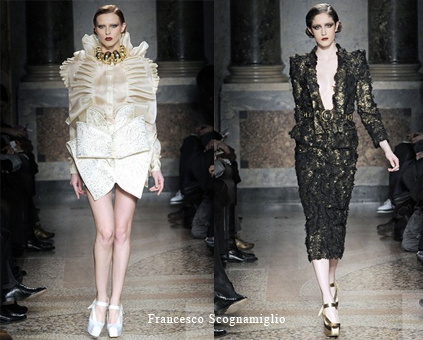 Francesco Sconamiglio – Babados e dobraduras descem pelas mangas do inverno de Francesco Sconamiglio enquanto os chapéus nos fazem lembrar os elegantes guardas londrinos. O desfile é de pretos e dourados, de alguns exageros, de saias que parecem apenas um grande laço de origami. Sensual para poucas.