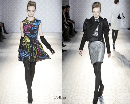 Pollini – O clima eqüestre deu o tom do desfile da Pollini, marca italiana que tem suas origens na produção de calçados. As estampas típicas de lenços, aquelas de arabescos encaracolados, apareceram coloridas e localizadas ou aplicadas em vestidos curtos, foram o ponto alto da coleção. Os ombros volumosos também estavam lá, formando a silhueta do momento.