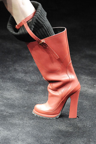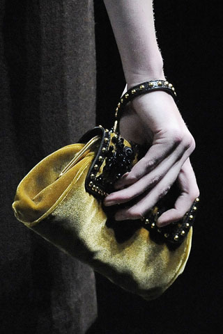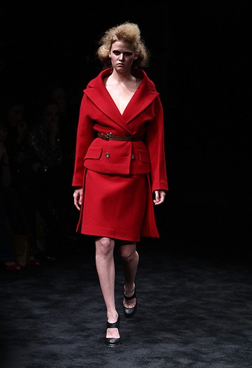 O desfile começa com os mencionados tailleurs e vestidos de lã e vai dando espaço para looks em veludo devoré, tricôs (como no micro short usado com cardigã), couro e peles – talvez a coleção mais ecologicamente incorreta da marca – tudo com fendas e decotes e em tons de marrom, vermelho, preto e vinho. Os ombros são destacados, porém de uma forma mais circular e a cintura é destacada em quase todas as peças. No final, uma onda selvagem toma conta dos vestidos em tiras de couro com tachas e bordados, lembrando uma gladiadora. Como sempre, os acessórios são de perder o fôlego: as botas vão até as coxas ou ficam abaixo dos joelhos, usadas com meias de barras viradas e uma tira prendendo-as às pernas, as sandálias tipo boneca têm saltos absurdos e um modelo com tiras de couro no salto vai roubar todas as atenções. As bolsas estão mais simples, de couro croco ou forradas de pele, ou são mini carteiras de plush com bordados, para carregar apenas o essencial, afinal, a mulher inteligente precisa de liberdade.