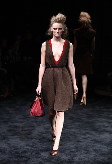 Eu sempre disse que vestir Prada não é para qualquer mulher. É para as inteligentes, as seguras de si, as que sabem seduzir sem ser óbvias. Encontrar alguém com uma bolsa ou um sapato da marca não é tão difícil, mas com as roupas… Miuccia Prada sempre encontra uma maneira peculiar de dar seu recado e desta vez ela mostrou que não é preciso se jogar nos anos 80 para exalar sensualidade ou escapar da crise. No seu outono/inverno 2009-10 o campo e a cidade se encontram. Entre botas de pescadores e tailleurs de lã ou vestidos de cintura marcada com decotes V profundos, é possível sentir seu desejo por liberdade e natureza, pela feminilidade forte que ela sempre defende.