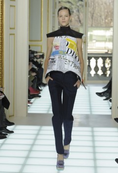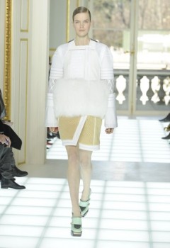 Balenciaga: poucos estilistas têm a capacidade de tirar nosso fôlego com suas criações e Nicholas Ghesquière é um deles. Entre o futurismo inspirado por “2001, uma odisséia no espaço” e a tradição e simplicidade do tricô, ele trouxe mais uma coleção-chave para a temporada. O desfile começou com tailleurs de formas quadradas, com bloco de pele na cintura. Depois foi a vez dos vestidos e túnicas, usados com calças mais curtas, em listras e cores contrastantes (amarelo, azul, verde água, salmão, rosa bebê e bege). As micro saias e os suéteres texturizados vieram em seguida, seguidos por blusas e jaquetas de couro com abas nas costas (o que conferia um volume extra visto de frente). Por fim, blusas estampadas com o que parecia ser anúncios publicitários. Bravo!