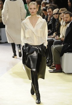 Céline: é incrível o que Phoebe Philo já fez pela marca em seu segundo desfile (e terceira coleção). Ela simplesmente deu o tom da moda da nova década, definindo muito bem o que é o minimalismo em 2010. Clássicos repaginados e alfaiataria são as palavras de ordem, porém o efeito surpresa aparece nos detalhes com os bolsos quadrados de couro, em vestidos e casacos, e os botões deslocados. Camisas, saias e jaquetas de couro, calças cigarrete, rendas e túnicas de lã, em tons neutros de preto, branco, marfim, marinho e verde musgo, são os essenciais da temporada. Outro detalhe importante: golas altas. Por fim, tricôs com alguns brilhos, botas, mocassins e cintos com fivelas de metal completam o que a mulher contemporânea precisa em seu guarda-roupa.