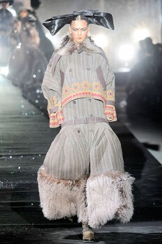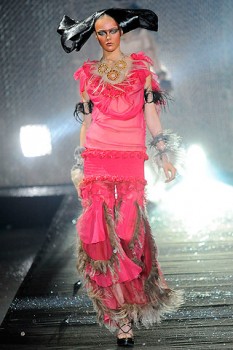 John Galliano: em mais uma de suas viagens pelo mundo, o estilista criou uma história sobre os nômades das montanhas do Oriente e injetou todo luxo possível em peças sobrepostas, com muitos detalhes de pele e bordados, transparências e brocados. Nas formas, muito volume nos macacões e casacos de cintura baixa e linhas mais ajustadas nos vestidos de chifon de corte enviesado e tons vibrantes (amarelo e pink).