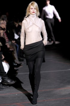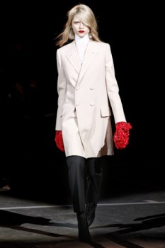 Givenchy: Riccardo Tisci se inspirou no esqui e no mergulho, porém, referências esportivas passaram longe dessa sofisticada coleção com muita alfaiataria, rendas e veludo. Os tons principais eram preto, vermelho e nude, que juntos ou combinados formaram ótimos looks. Os blazers de smoking usados com calças retas eram impecáveis, assim como os mini vestidos e mini saias de zíperes abertos, formando abas laterais. As blusas com babadinhos confirmam o trabalho minucioso do estilista. No mais, luvas em vermelho e dourado, botas de laços, meias trabalhadas e blusas de plumas.