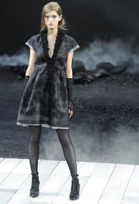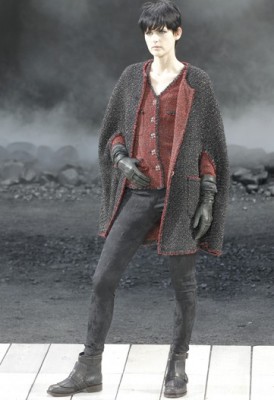 No inicio do penúltimo dia da temporada, Karl Lagerfeld transformou o Grand Palais num cenário apocalíptico, um verdadeiro jardim de cinzas. Será que o fim do mundo está próximo pro estilista da Chanel? Bem, pelo sim, pelo não, os tweeds e couros dominaram a coleção, quase toda em tons de preto e cinza, com pequenos toques de vermelho e verde. Com calças largas de barras viradas usadas com uma sobreposição (na verdade peça única) de cardigã e blazer ou tailleurs sobre calças skinny, as formas no geral não eram muito favoráveis. Melhores foram os tubinhos em A do final, que quebraram a excessiva androginia das outras peças.