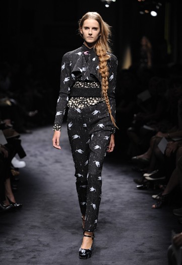 Miu Miu: o que significa inocência e juventude hoje? A partir desta pergunta Miuccia Prada criou uma coleção cheia de mensagens sublimadas, principalmente nas estampas, que tinham gatos, pássaros e mulheres nuas. O desfile começou com terninhos de calças retas e lisas, usadas com micro jaquetas vazadas no peito, abrindo espaço para bustiês ou camisas aparecerem. Saias A e de pregas também apareceram. No final, foi a vez dos vestidos bordados em tecidos transparentes e de algumas mangas fofas. Nos cabelos das modelos apliques de tranças compridas davam o recado final sobre a inocência do século XXI.