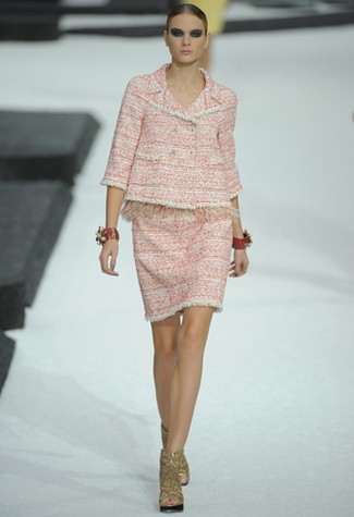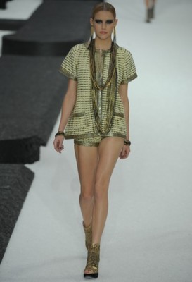 Os primeiros looks eram tailleurs com vários furos, revelando camisas e vestidos brancos, seguidos por mini vestidos retos, os tais jeans já mencionados e mais tailleurs, só que com tons pastel e diferentes texturas de tweed. Vários micro shorts com jaquetinhas e colares de muitas voltas vieram logo depois, substituídos pelas peças com detalhes de plumas e uma série de looks com estampa floral gigante – valendo até sombrinhas na passarela!